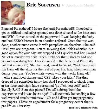 “The same thing happened to my friend at Planned Parenthood 21 years ago [in New Jersey]. She went in for a free pregnancy test (which was not free) and the only question they asked her was “when do you want to schedule your abortion?” When she said she didn’t want an abortion, they booted her out the door.”